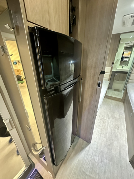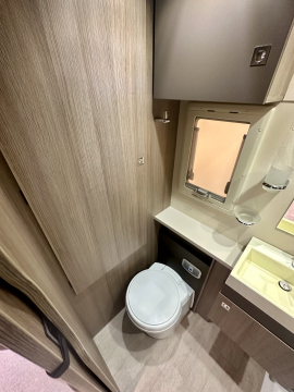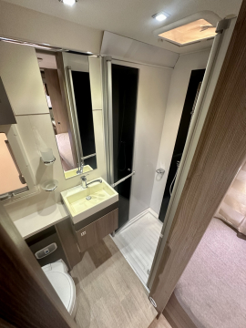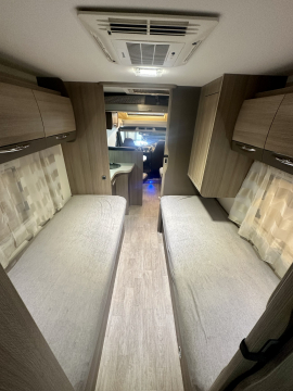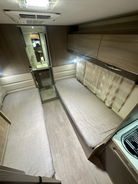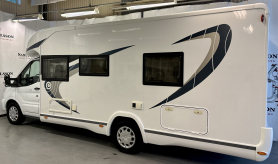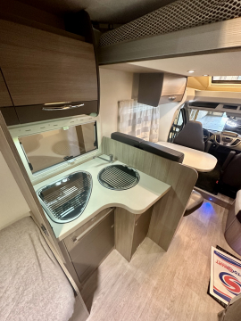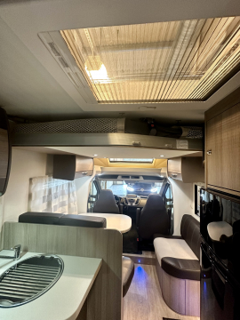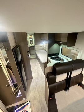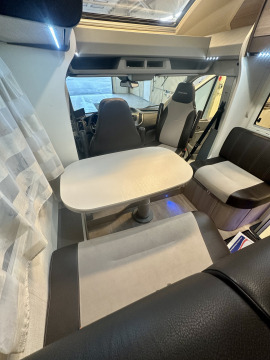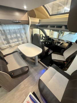 En mycket smarta och praktiska planlösningen. De träfärgade skåpsluckorna med det vita bordet och bänkskivan tillsammans med den tvåfärgade delläder-klädseln visar tydliga tecken på den imponerande franska designen. Det finns gott om plats för flera personer i loungen och med dom svängbara stolarna blir det väldigt rymligt kring matbordet. Långbäddar . Är man flera personer så finns den rymliga nedsänkbara sängen över sittgruppen, även sittgruppen går att bädda vilket gör att 5 personer får plats att sova . Samt av i bodel